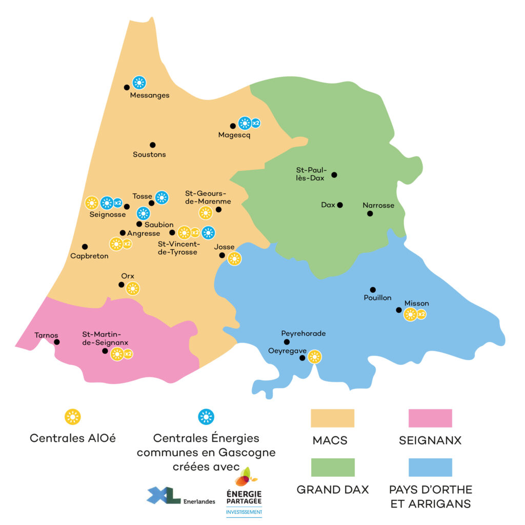 ALOé est une société citoyenne qui a pour objet de financer et d’exploiter des centrales de production d’énergie renouvelable (soleil, vent, biomasse, hydraulique…) sur le territoire du Pays Adour Landes Océanes (ALO) qui couvre les intercommunalités du Seignanx, de MACS, du Pays d’Orthe et d’Arrigans et du Grand Dax. ALOé se rémunère sur la vente de l’énergie produite et peut ainsi investir dans de nouveaux projets. ALOé peut également être Personne Morale Organisatrice (PMO) pour créer et administrer des boucles d’Auto-Consommation Collective (ACC).